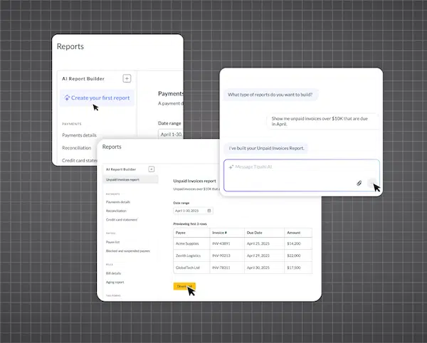 Our AI Report Builder is currently in Beta as part of Tipalti Accounts Payable, with the ability to pull insights from our Procurement module as well. If you’re a Tipalti customer interested in joining the Beta program, please reach out to your Tipalti Representative. If you haven’t implemented Tipalti yet, we’d like to give you a live demo of these newest capabilities—contact us using the link below.