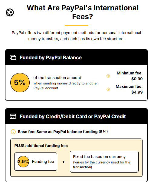 If funded by credit card, debit card, or PayPal Credit, an additional 2.9% plus a fixed fee is charged on top of the 5% fee. It’s important to understand these personal international payment fees, as they differ from business transaction fees.