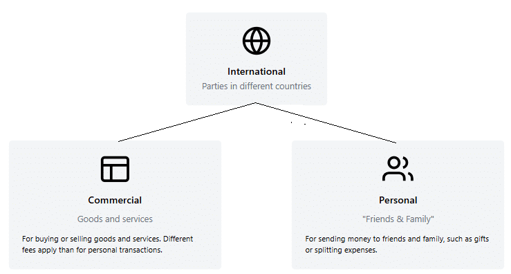 Personal payments like above are for sending money to friends/family — things like gifts or splitting expenses, while commercial transactions involve buying or selling goods or services. For such transactions, different fees apply. It’s important to correctly identify the payment type. Using personal payments for business can cause account problems and loss of purchase/seller protections.